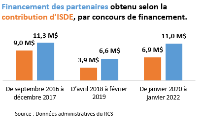 Le RCS affecte des fonds à ses activités conformément à ses ententes de contribution avec ISDE. Depuis 2016-2017, ISDE s'est engagé à fournir au RCS un financement de 36 millions de dollars sur six ans.