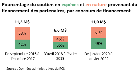 - Partenaires : Les organismes sans but lucratif, les organismes de bienfaisance dans le domaine de la santé, les organismes sans lien avec le gouvernement fédéral et l'industrie fournissent des contributions en espèces et/ou en nature aux projets financés par le RCS.